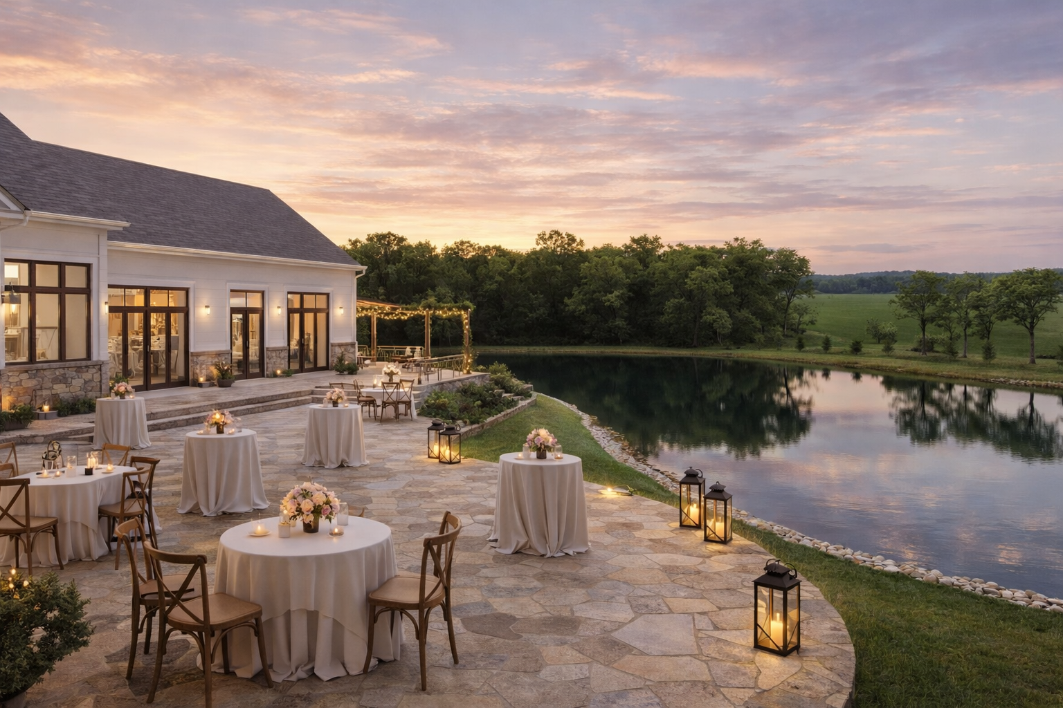 The Reflections Patio is an elegant open-air gathering space that seamlessly connects the heart of the celebration, joining the ceremony setting of The Queen Anne Room with the main reception area, The Meadow Ballroom. Situated beside a beautifully groomed, picturesque pond, the patio offers a serene and romantic backdrop enhanced by its generous size and meticulously landscaped surroundings. Designed for effortless flow and unforgettable moments, The Reflections Patio is the perfect setting for cocktail hours, first greetings, and celebratory toasts, while also transforming beautifully into an elegant dance area under the open sky. With its natural beauty and intentional connection to every stage of the celebration, The Reflections Patio invites guests to gather, celebrate, and reflect on moments of the evening.